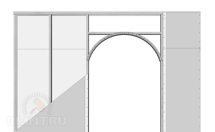 Если каркас монтируют в перегородке из ГКЛ, то там хорошо видно, как его надо закрепить, чтобы арка была на одном уровне с поверхностью стены.