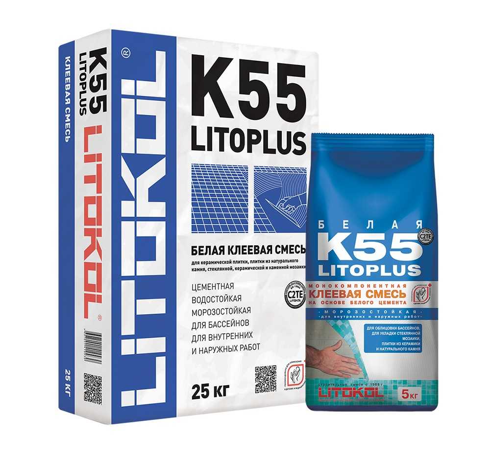 Клей для плитки LITOKOL LITOPLUS K55. Специализированный состав, основным компонентом которого является цемент белого цвета. Предназначен для фиксации компонентов мозаичных панно из стекла, керамики или камня. Обладает хорошей адгезией и повышенной тиксотропностью, что исключает сползание отдельных элементов облицовки при укладке. Подходит для наружных и внутренних работ.