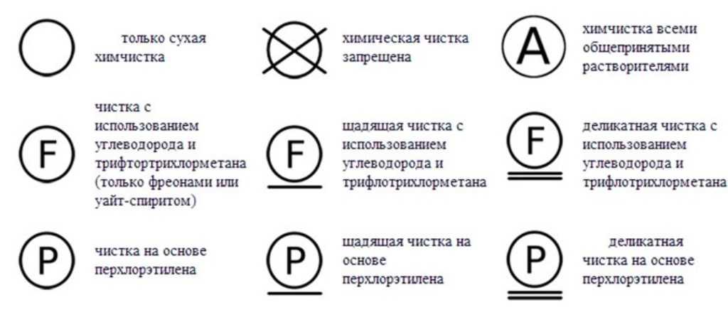 - круг с буквой «Р» внутри – чистить можно с любым растворителем, кроме трихлорэтилена;
