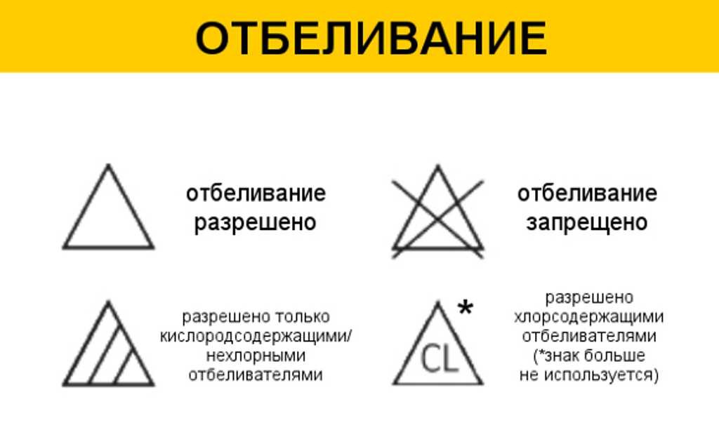 - треугольник с двумя параллельными полосами внутри, или зачеркнутый треугольник с буквами «Cl» внутри – отбеливание возможно только средствами, не содержащими хлора;