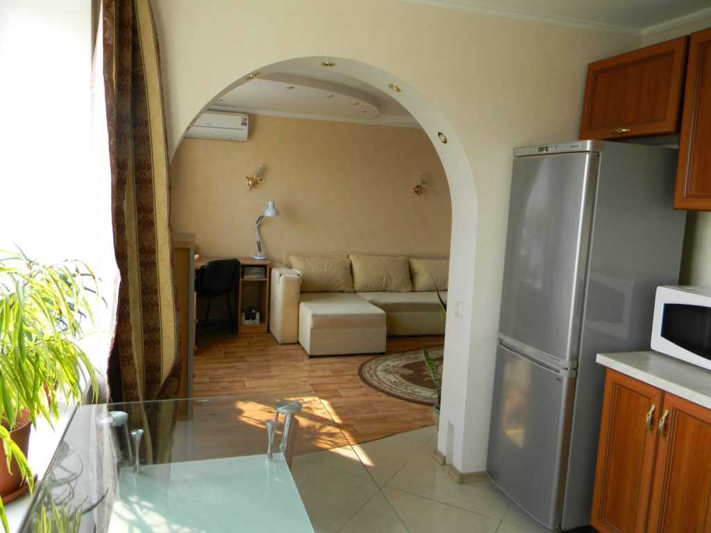 С помощью арочного проема часто объединяют малогабаритную 5–6-метровую кухню в хрущевке с лоджией или балконом. Часть стены, служившей некогда подоконником, можно оформить в виде барной стойки. Или вмонтировать в арку полочки, где будут храниться кухонные аксессуары.