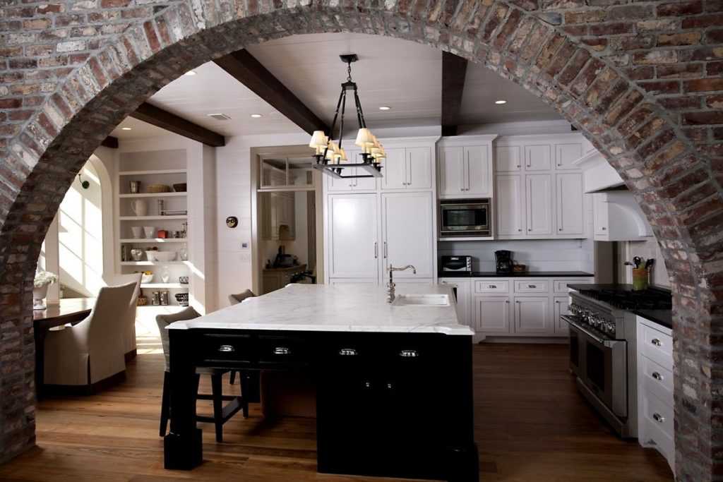 Отличный вариант отделки. При помощи камня переход с кухни в другую комнату будет выглядеть презентабельно и достаточно оригинально. Работа с камнем потребует мастерства и для этого дела лучше стоит нанять специалиста. Камень достаточно дорогостоящий материал, но долговечный и надежный в эксплуатации. Каменная арка по своему внешнему виду будет отсылаться к эпохе Средневековья.