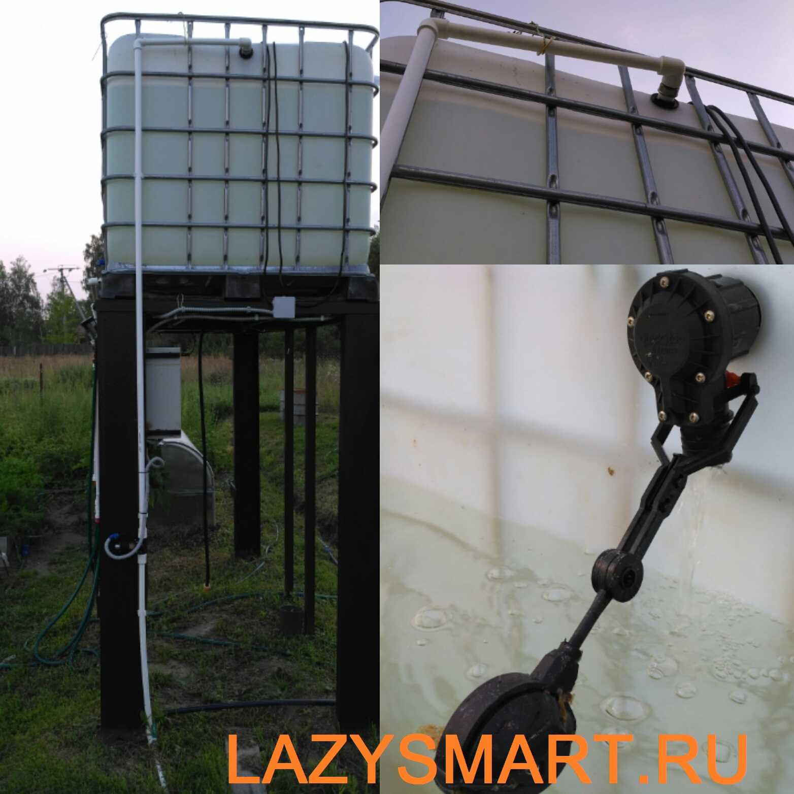 Резервуары объединены по принципу «сообщающихся сосудов» — поэтому условно можно говорить, что это одна ёмкость для накопления воды. В качестве резервуаров были применены еврокубы.