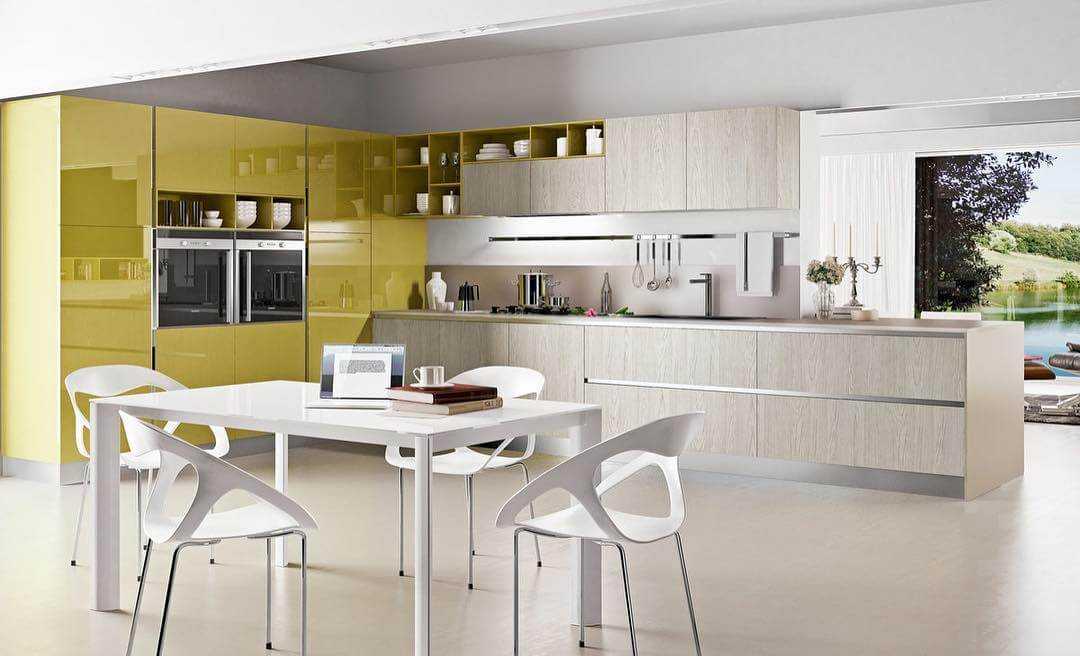 Порой в проем между частями столешницы устанавливаются такие бытовые приборы, как стиральная или посудомоечная машина. Белые бытовые приборы особенно удачно впишутся в композицию светлой кухни.
