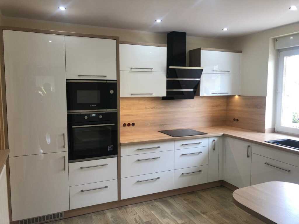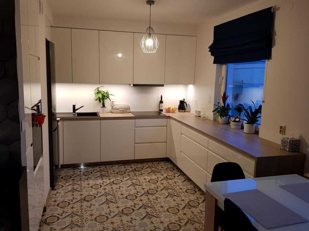 Белая лакированная кухня с деревянной столешницей? Способ отделки кухонных фасадов должен зависеть от индивидуальных предпочтений инвестора. При выборе между матовым и глянцевым покрытием также стоит обратить внимание на практический аспект – отпечатки пальцев легче оставить на блестящих поверхностях