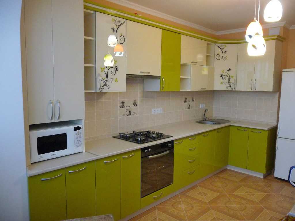 Глянцевые фасады расширят даже небольшое помещение, но необходимо следить за тем, чтобы солнечные лучи или от светильников не попадали в глаза, отражаясь от дверец гарнитура.