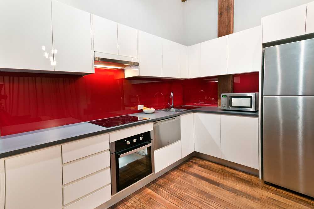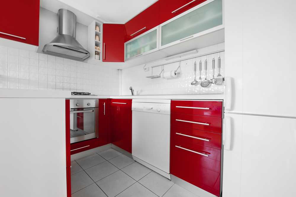 К примеру, отлично будет выглядеть сочетание белого гарнитура и красного фартука. Красными могут быть некоторые предметы мебели и бытовой техники — стулья, холодильник, микроволновая печь и т. д.