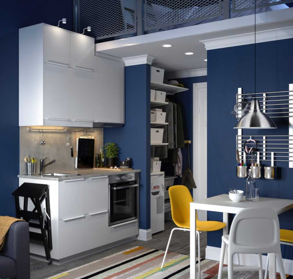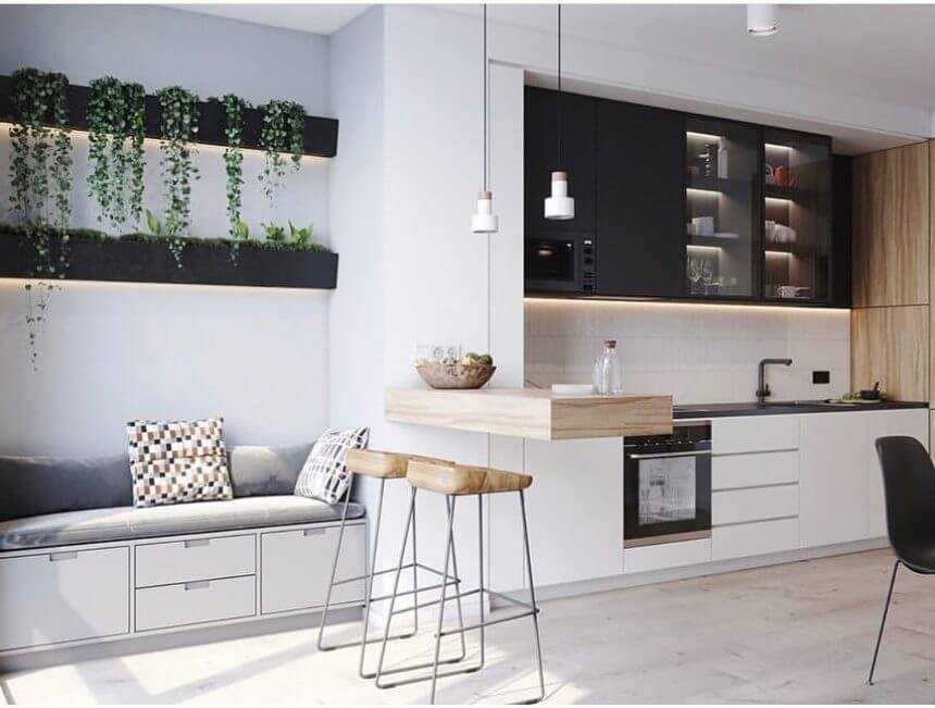 Иногда на белоснежной мини-кухне можно поставить темные предметы интерьера. К примеру, черный шкаф можно повесить на белой стене, а ящик для столовых приборов такого же цвета посреди двух белых.