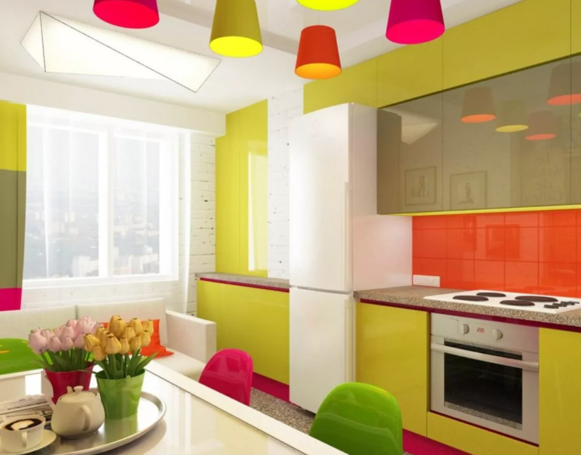 Удачное сочетание цветов в интерьере кухни показывает наличие у жильца хорошего вкуса. Маленькая кухонька будет выглядеть современно, если покрасить стены в белый цвет и повесить на них узорчатые шкафы. Фартук можно выложить из кирпичей или плит, причем необязательно прямоугольных. Иногда стены маленькой кухни украшают шестиугольными плитами.