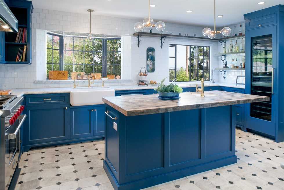 Островная планировка прекрасно вписывается в формат кухни-гостиной. Прекрасное сочетание, которое всегда работает: гарнитур с синими фасадами, а на островке — светлая мраморная столешница.