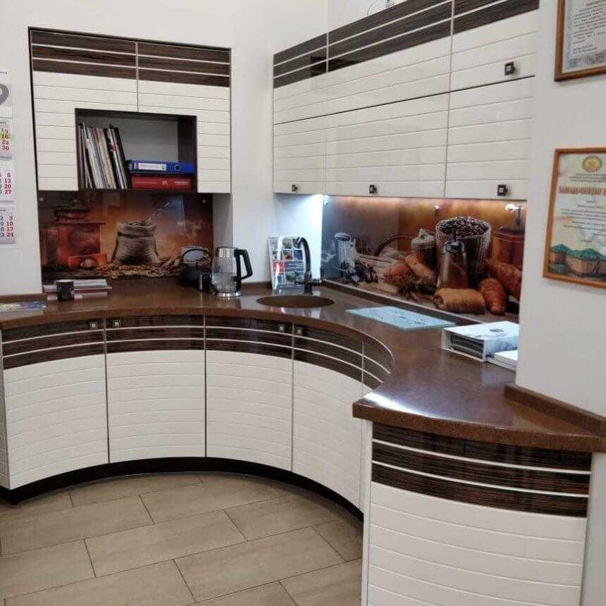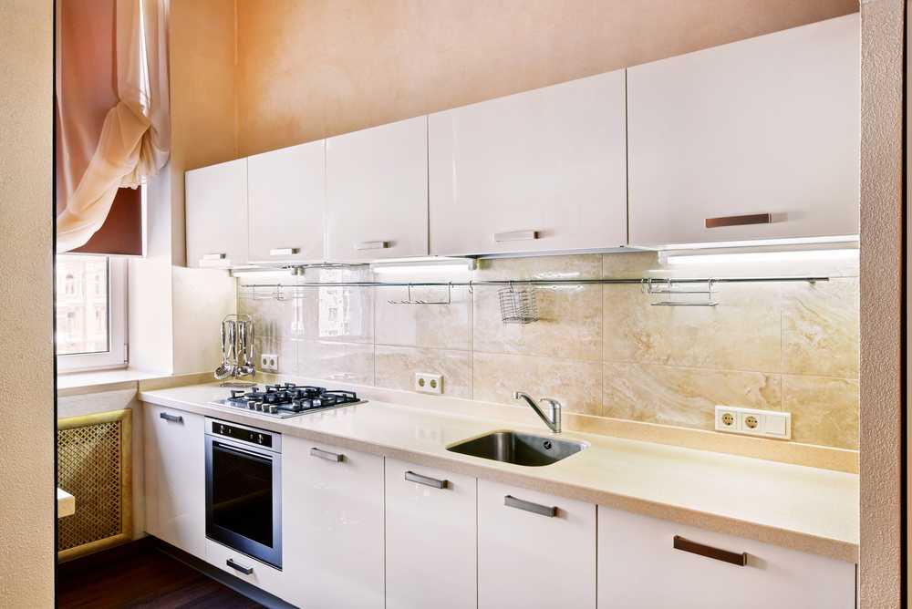 В глянцевых кухнях можно разместить каменные (гранитные) столешницы, столешницы из агломерата, архитектурный бетон, а также ценные породы дерева. Будьте осторожны с ламинатными столешницами, которые любят разбухать и растрескиваться по краям.