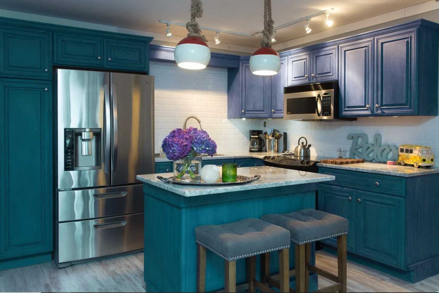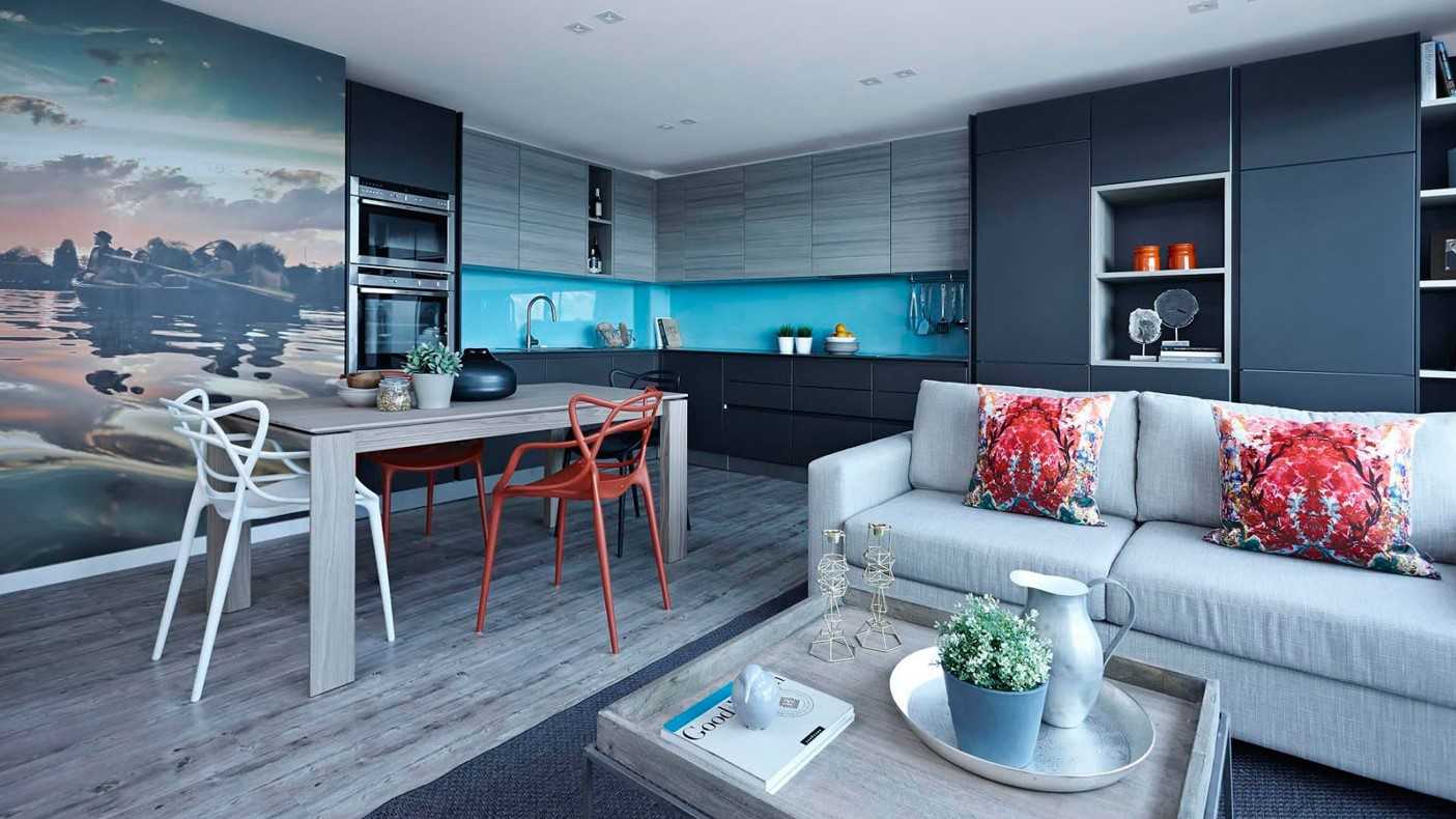 А вот симпатичный вариант обустройства кухни-гостиной, где синий предстает сразу в нескольких своих температурных «ипостасях»: небесный, сапфировый, бледно-васильковый. Разумеется, акценты гармонично распределены по всему пространству, чтобы напрочь исключить какую-либо навязчивость.