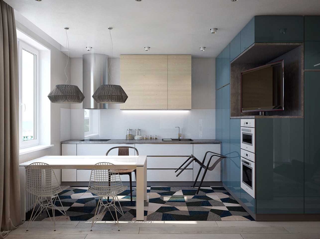 Пример объединения кухни с гостиной, где гарнитур имеет привлекательный оттенок синей стали. Это невероятный уровень органики для стильных модерновых интерьеров.
