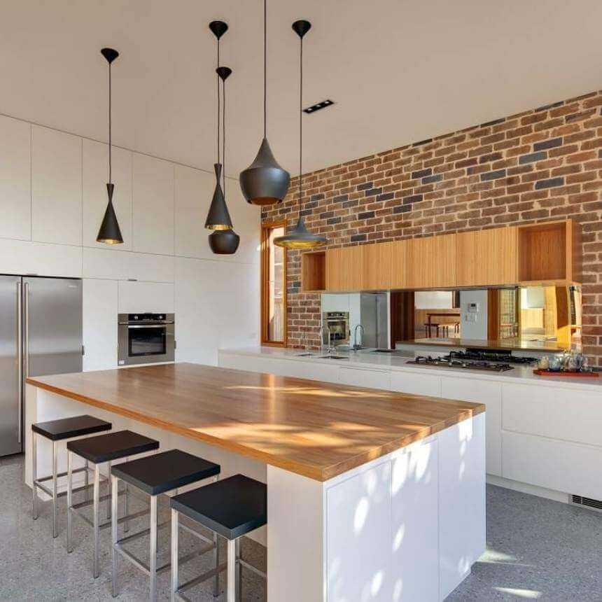 Серо-белая кухня с деревянной столешницей отлично подойдет для небольших комнат, которые вы хотите визуально увеличить и осветлить. На нижних шкафах можно использовать серые фасады, а на верхних – белые. Кирпич на стене также отлично подойдет в таком интерьере, так как подчеркнет неповторимость помещения. Серо-белая кухня с деревянной столешницей – классическая идея для уютного и эстетичного интерьера.