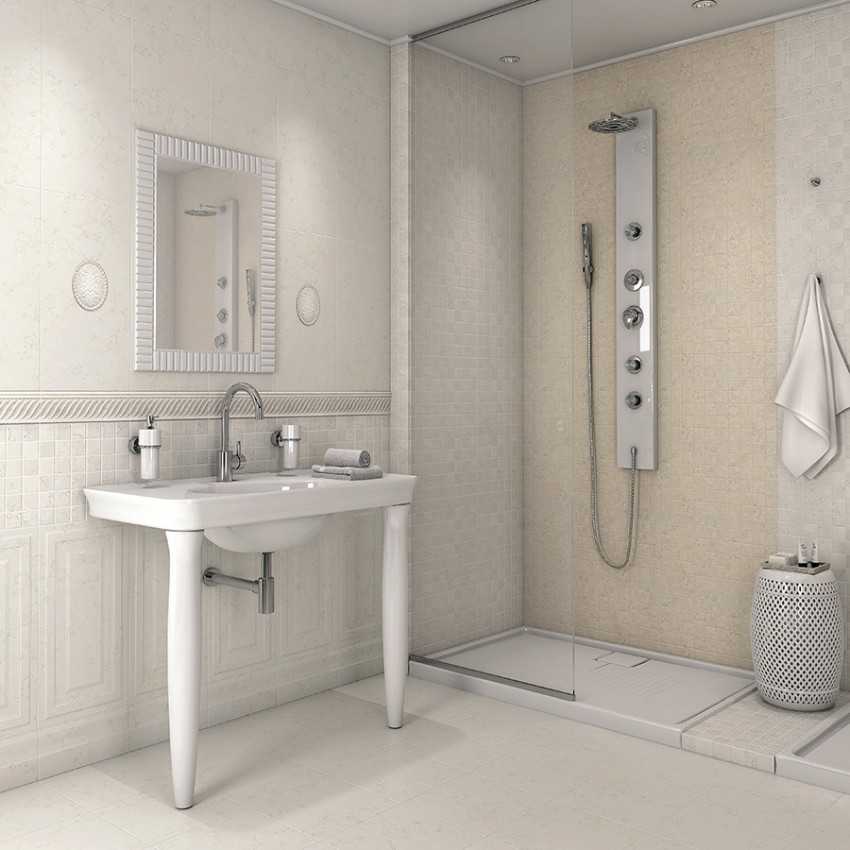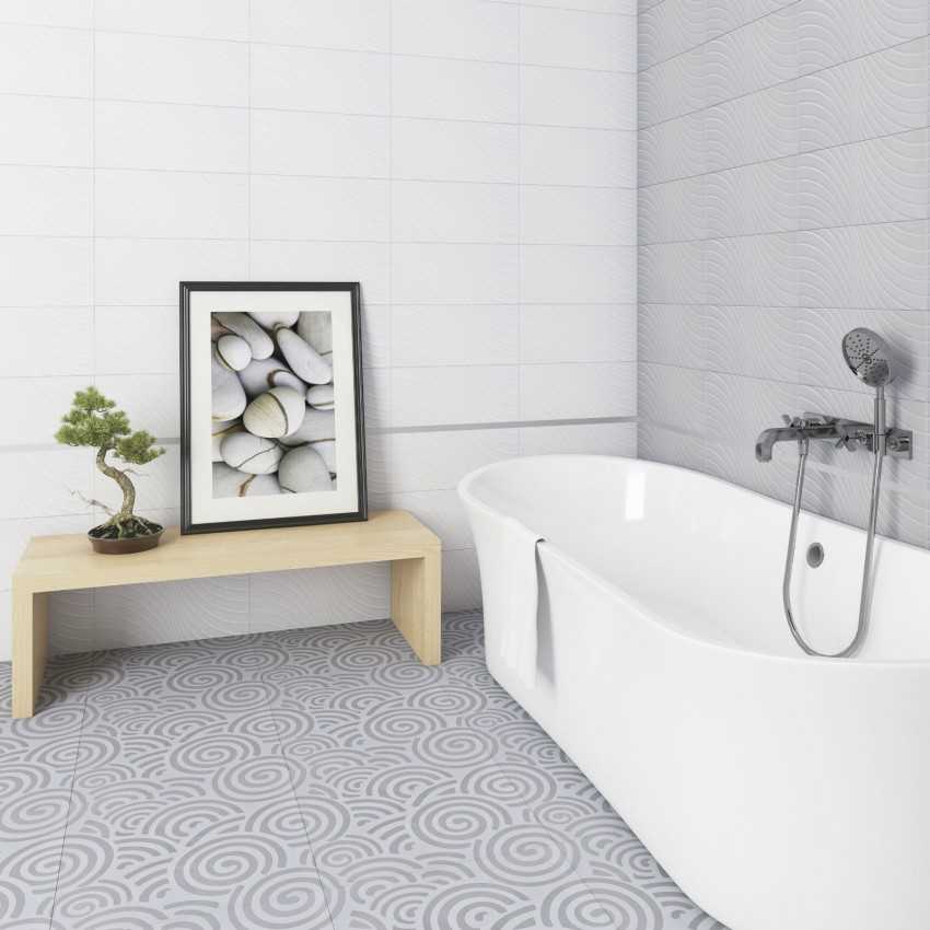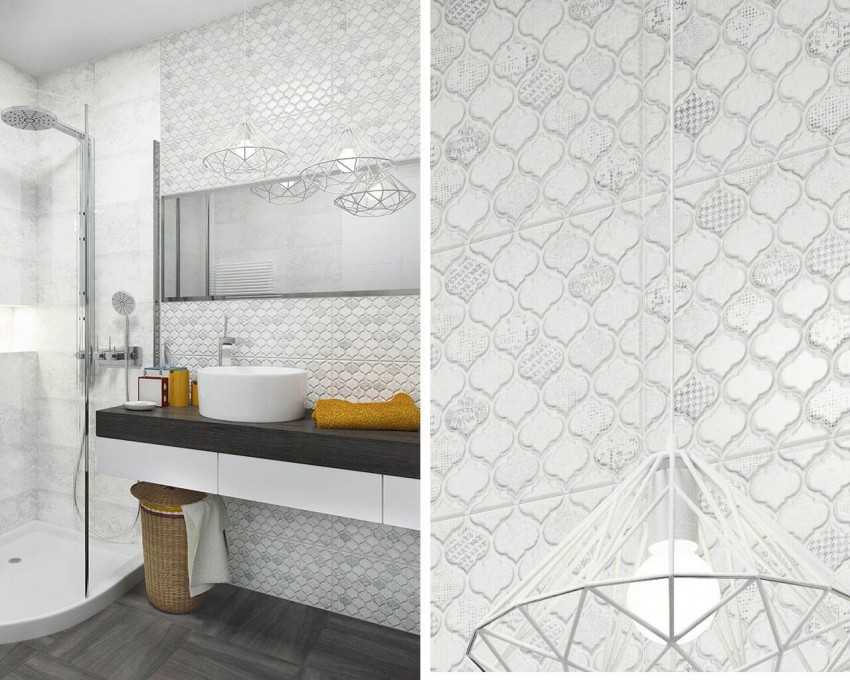 Комбинирование гладких и фактурных разновидностей позволяет добиться необычного эффекта при составлении интерьерного фона ванной. Производители выпускают широкий перечень подобной продукции для отделки ванных комнат. Коллекции постоянно обновляются, для придания фону завершенности можно подобрать к белой плитке бордюр, мозаичное панно, создать разноразмерный вариант оформления стен. Интересна разновидность «кабанчик» с фаской, которая может иметь и прямые торцы.