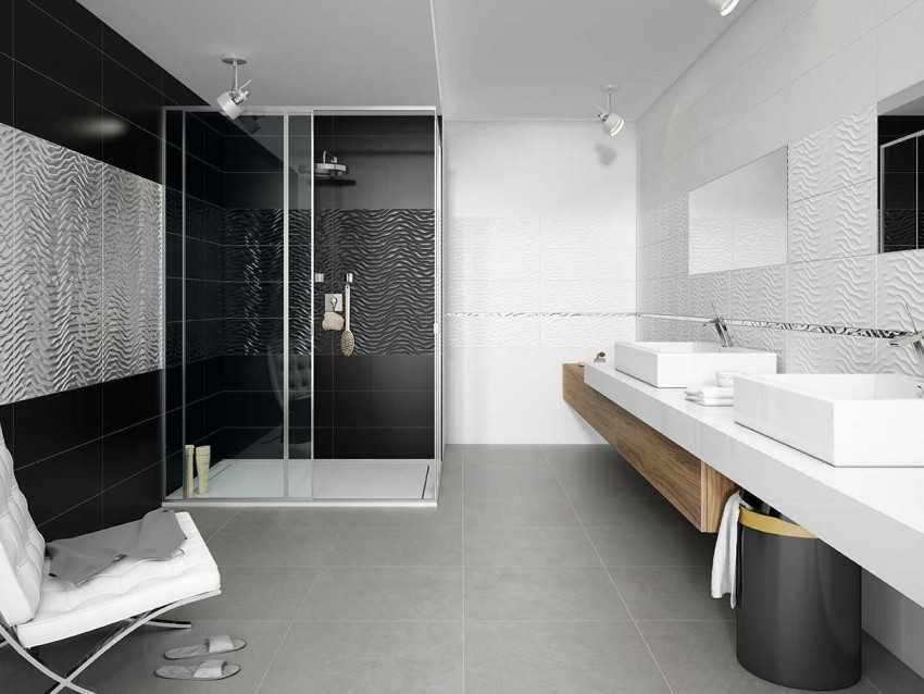 Для создания идеального дизайна ванной комнаты можно использовать уже готовые коллекции чёрно-белой плитки, включающие отделочные материалы разной формы и размера для оформления помещений в современном и классическом стилях. Какие бы идеи не воплощались при помощи двух радикальных цветов, нельзя допускать, чтобы помещение ванной выглядело скучно или хмуро
