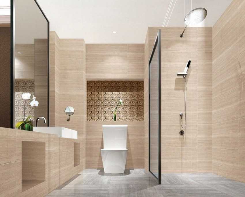 Если ванная выполнена в стиле модерн, то бежевая плитка подойдет как нельзя лучше. Цветовая гамма должна быть приглушенной, контрасты используются редко.