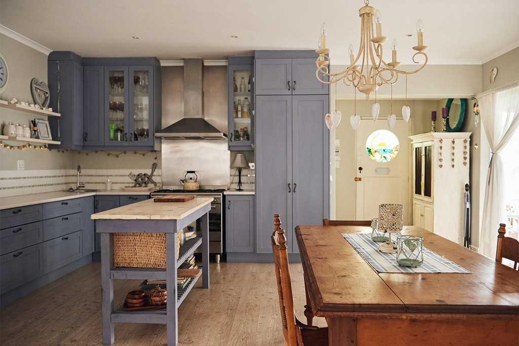 При отделке потолка не допускаются натяжные полотна и гипсокартон — только краска и штукатурка, в целом такой интерьер должен создавать ощущение деревенского домика. Все элементы декора должны иметь следы времени — при желании всегда можно нанести их самостоятельно. Мебельный гарнитур должен быть выполнен из древесины, хорошим дополнением сине-голубым кухонным модулям станет обеденный стол цвета натуральной древесины.