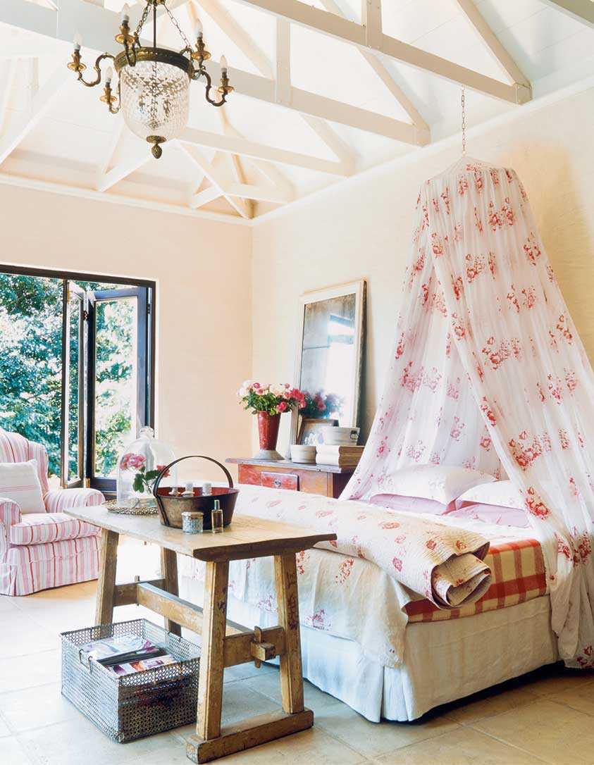 Сочетание белой мебели, оттенков натуральной древесины, неба, травы и растительного орнамента в текстиле, отделке стен сделают спальню романтичной, светлой и уютной.