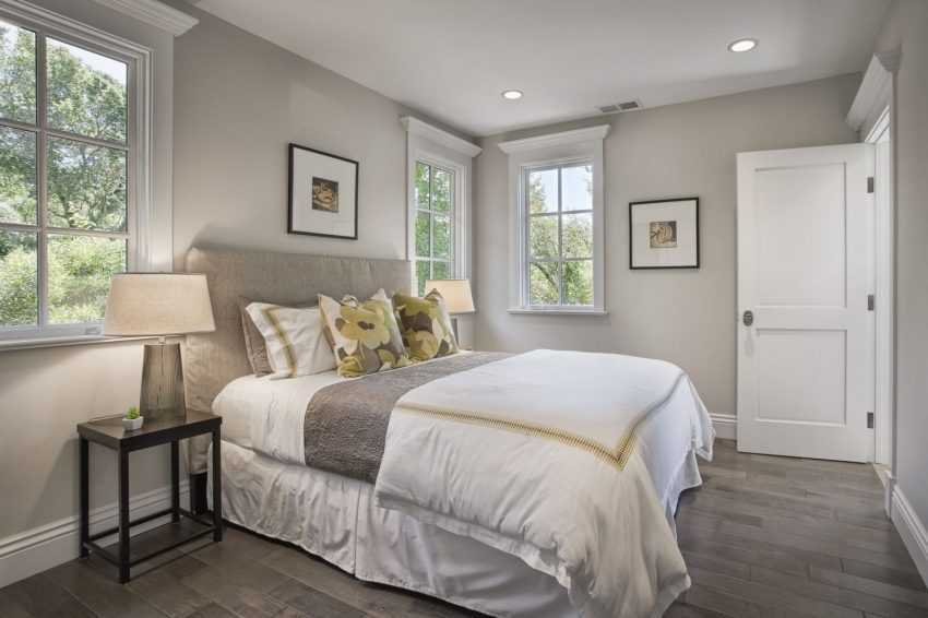 - Основным цветом должен быть белый. Он позволит добавить комнате объема, сделает ее визуально шире и просторнее. Вдобавок спальня будет казаться намного светлее.