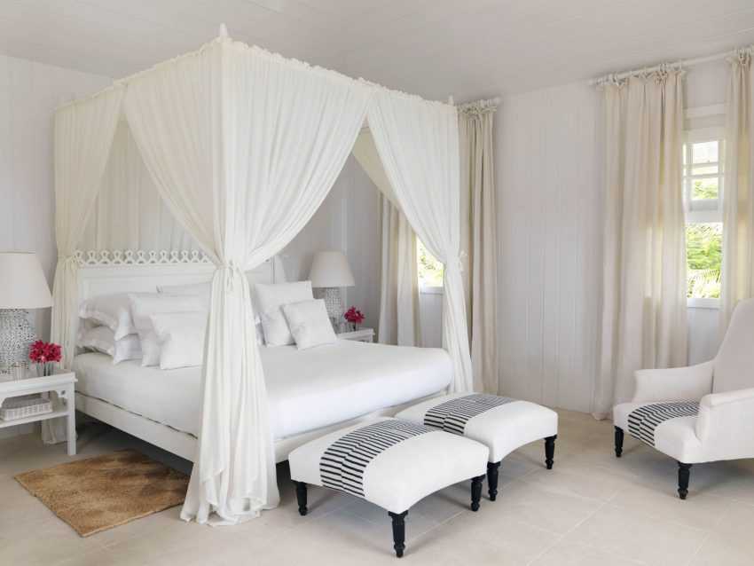 Спальную комнату обставляют мебелью, которая сделана из натурального дерева, окрашивают её в белоснежный цвет таким образом, чтобы текстура просвечивалась через краску.