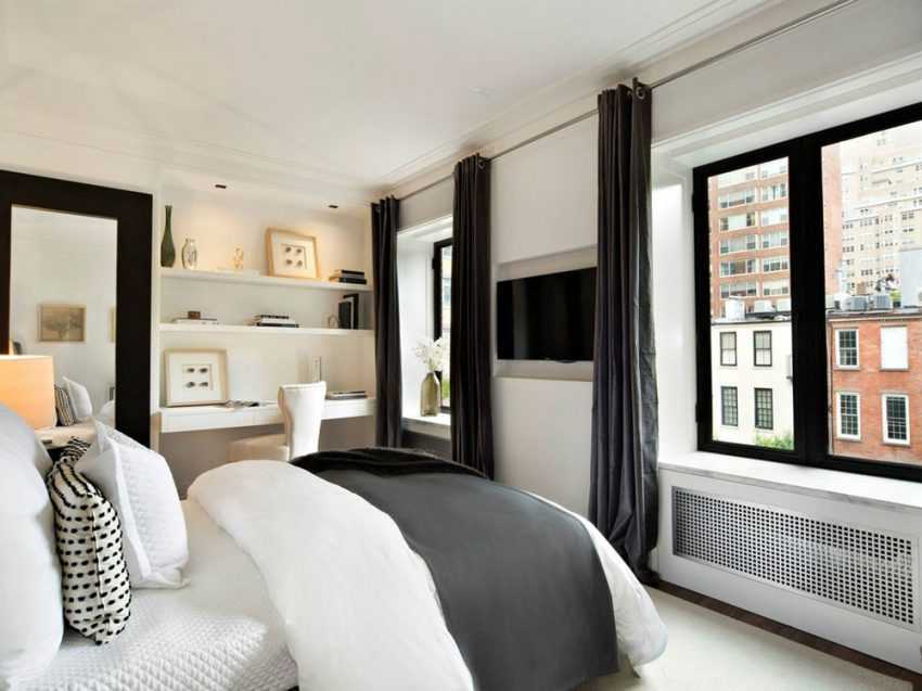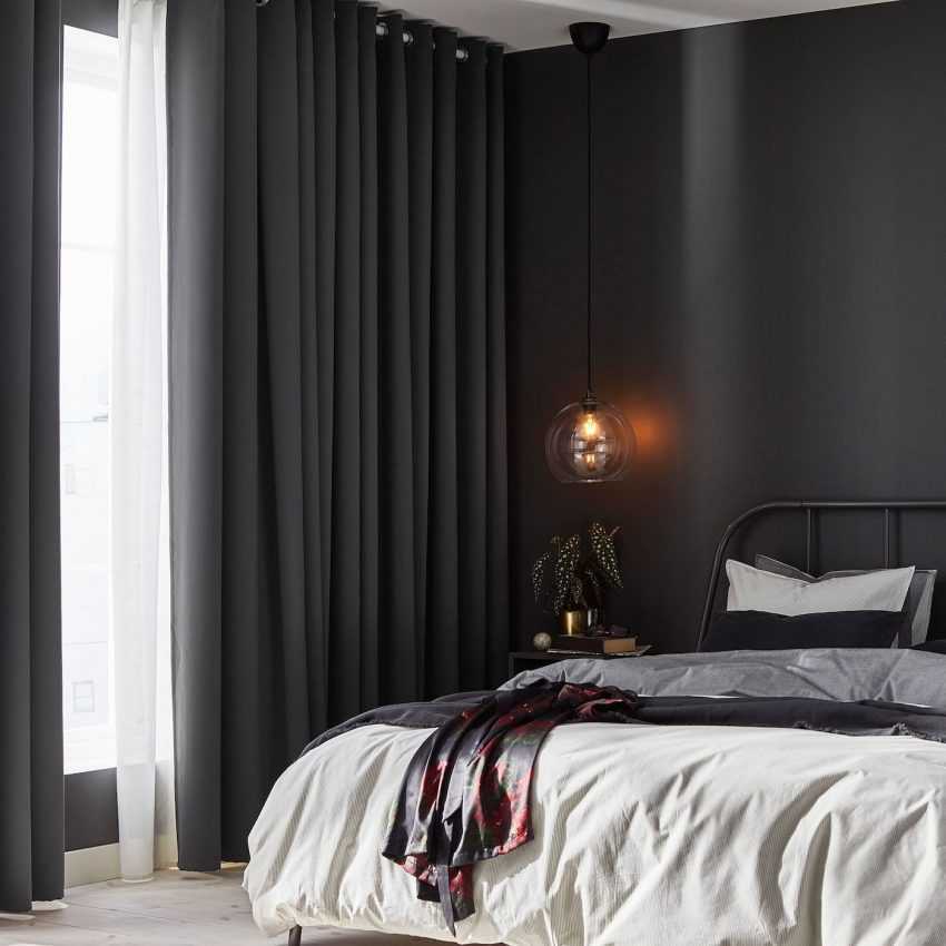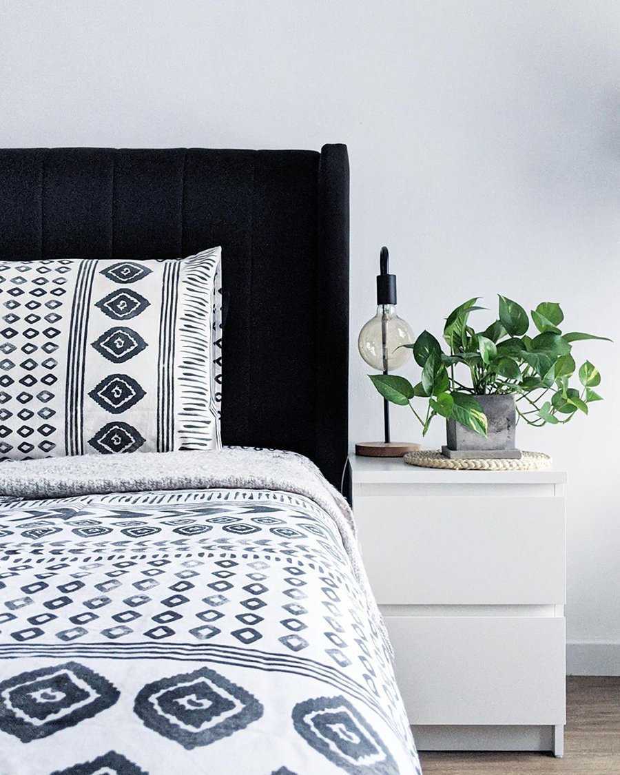 Другой вариант – повесить орнаментные шторы в черно-белую спальню