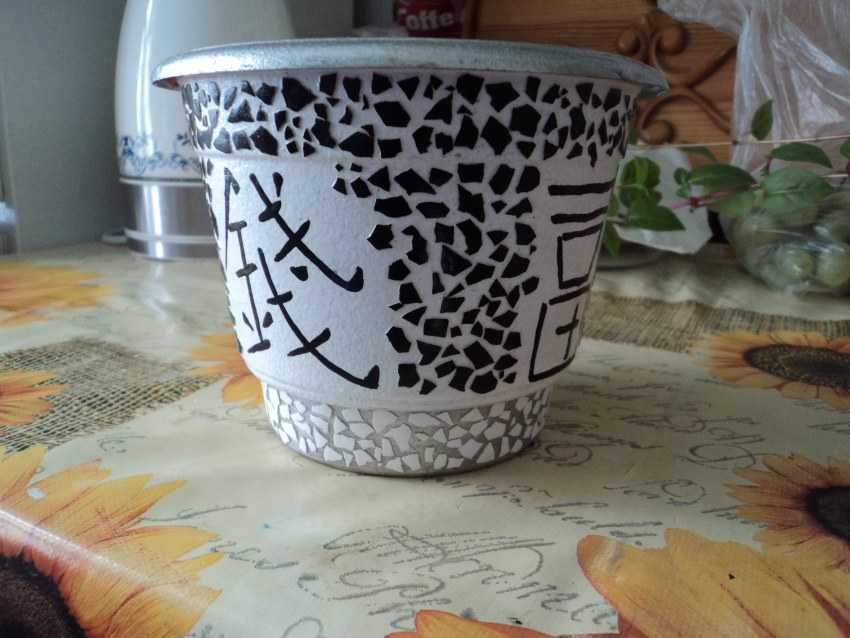 Чистым листом для творчества выступает жестяная банка или целое ведро, на поверхность которого наносят штукатурный раствор и монтажную сетку. После того как мозаика выложена, изделие высушивают, а пустоты между элементами заполняют затиркой.