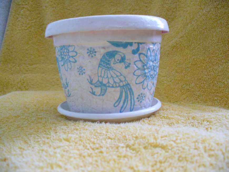 Техника, что позволяет перенести на поверхность горшка изображение с листа бумаги или салфетки. Для декорирования потребуется глиняный, стеклянный или керамический горшок в светлых тонах. Бумагу с картинкой или салфетку прикладывают к поверхности и аккуратно покрывают слоем клея, после чего изделие высушивают и покрывают бесцветным лаком.