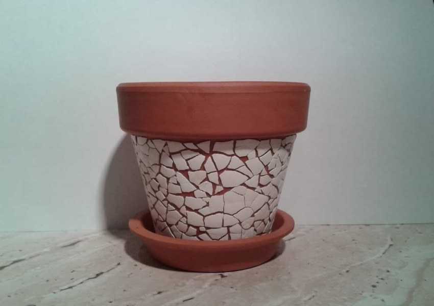 Декор горшков для цветов в стиле кракелюр завершается нанесением слоя краски, который может выступать как основным фоном изделия, так и стать цветной основой для дальнейшего украшения предмета. При окраске скорлупы следует учитывать, что даже после высыхания мозаика достаточно подвижна. Готовое изделие вскрывается слоем лака.