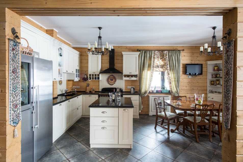 На кухне также часто применяют обшивку потолка пластиковой вагонкой, так как она идеально имитирует не только дерево, но и натуральный камень. Чтобы интерьер приобрел завершенный образ, подвесные конструкции можно дополнить элементами декора из стекла и металла. Например, подвесить кованые люстры и поместить стол со стеклянной столешницей. При этом предметы мебели желательно выбирать из дорогих пород дерева – такой подход подарит комнате шик.