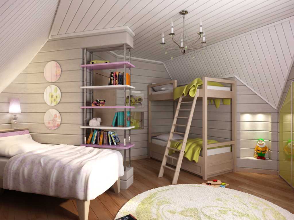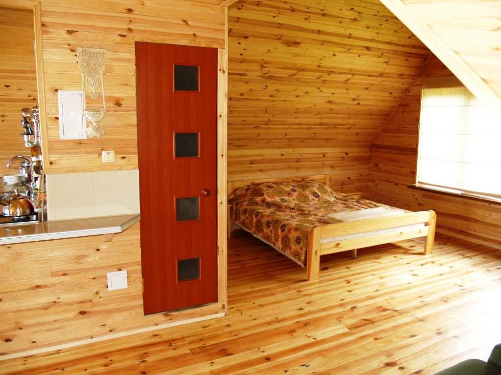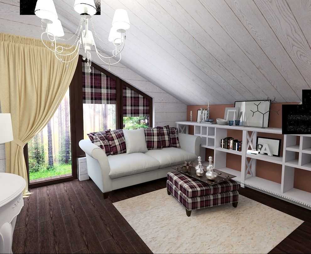 Такие помещения смотрятся очень тепло и уютно, в них комфортно отдыхать от городской суеты. Лучше всего обставлять комнату светлой мебелью, чтобы не перегружать пространство одинаковыми оттенками. Обычно расстановку и количество мебели планируют в соответствии с длительностью проживания. Если это лишь летний период, то хватит кровати и тумбы для необходимых вещей. Для круглогодичного пребывания никак не обойтись без большого и вместительного шкафа, комодов и тумбочек.