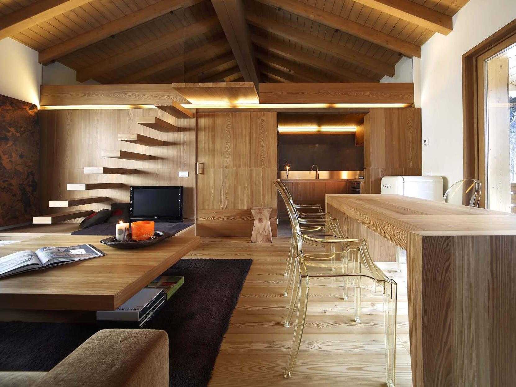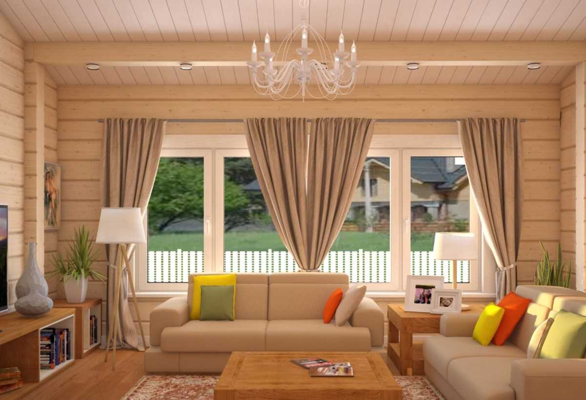 Светло-коричневый интерьер дачного домика привлекает внимание, подчеркивает уютную и теплую атмосферу. Чтобы помещение смотрелось еще более светлым, организовывают правильное освещение