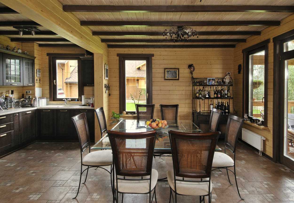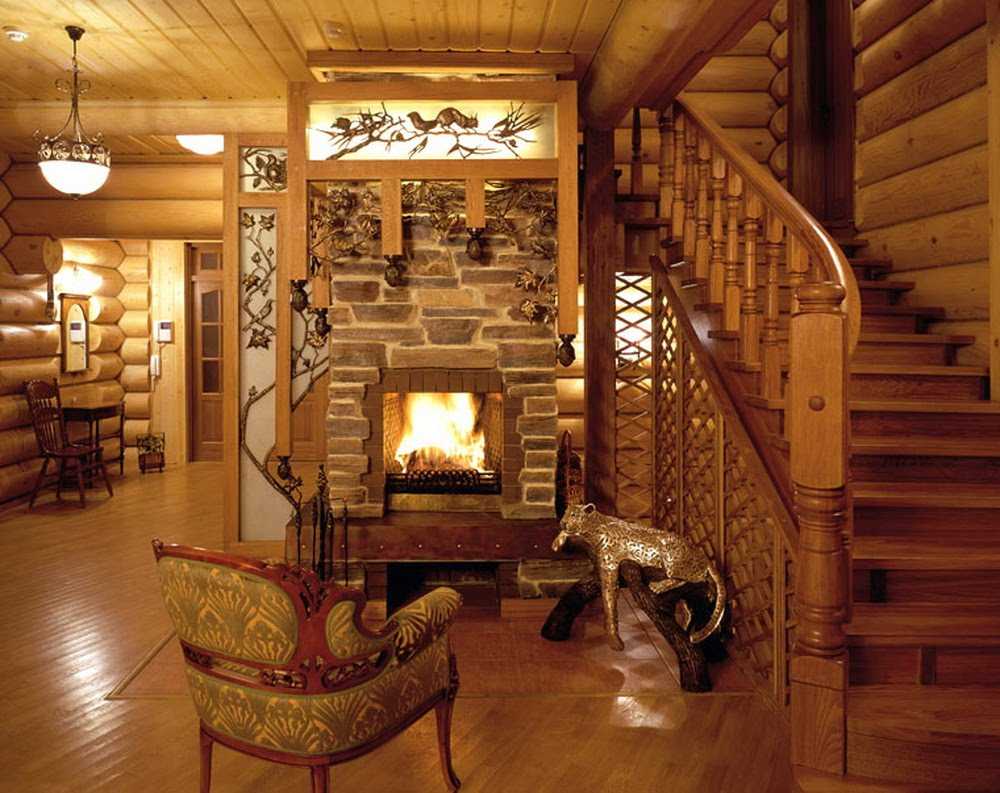 Деревенский дом подразумевает под собой оформление деревом. Вся отделка стен, потолка и пола должна быть выполнена из деревянных материалов, которые не только прекрасно выглядят, но и являются экологически чистыми продуктами. Если дом построен из хорошего и красивого бревна, то стены, скорее всего, даже не требуют отделки. Просто покрываются тонирующими составами после шлифовки.