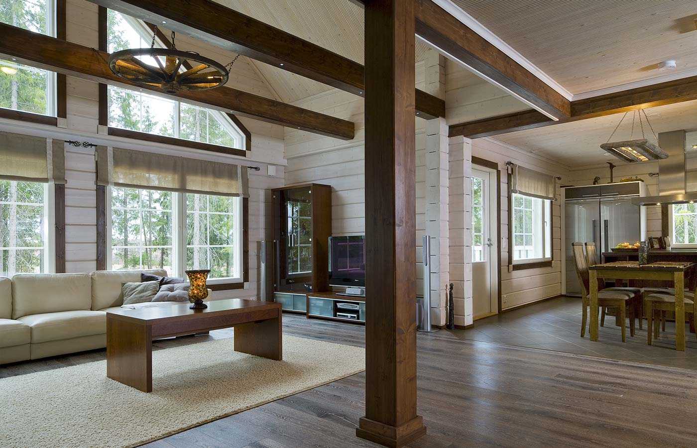Преимуществом дерева является то, что этот экологически чистый материал никогда не выходит из моды. Ценители древесных фактур будут с наслаждением рассматривать стены и потолки, декорированные в таком варианте, и получать наслаждение от отдыха в загородном доме. Деревянные балки можно оставить некрашенными, можно покрыть лаком или внести легкость в пространство, прокрасив некоторые участки комнаты в белый или телесный цвет.