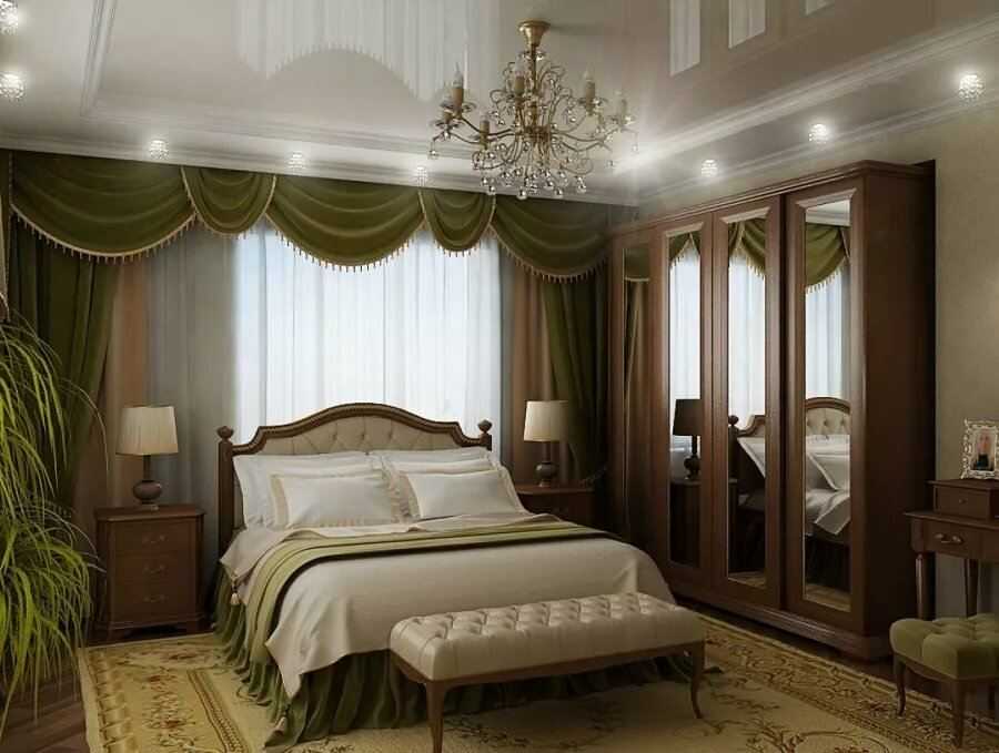 - минимальный набор мебели: кровать, шкаф, тумба или небольшой комод, зеркало; если площадь позволяет, дополнить полками и креслом;