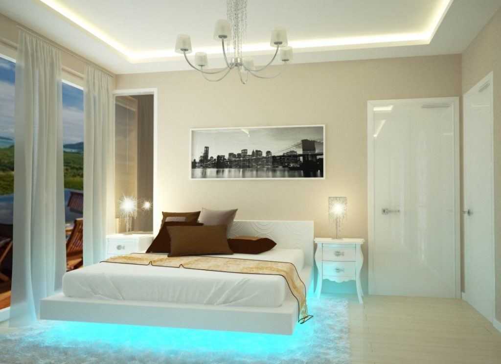 Для ночного времени можно использовать точечные лампы, встроенные в фасады мебели, потолочное перекрытие. Светодиодные лампы и модульные светильники используют также для проведения зонирования в спальной комнате.