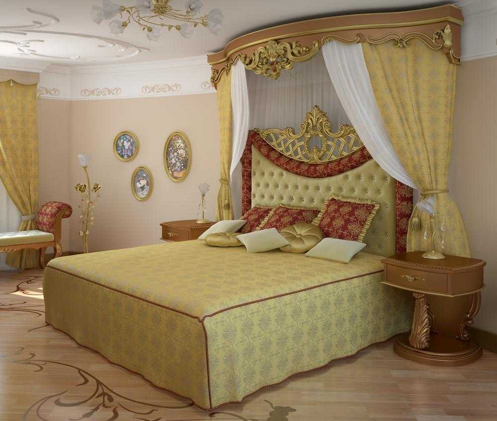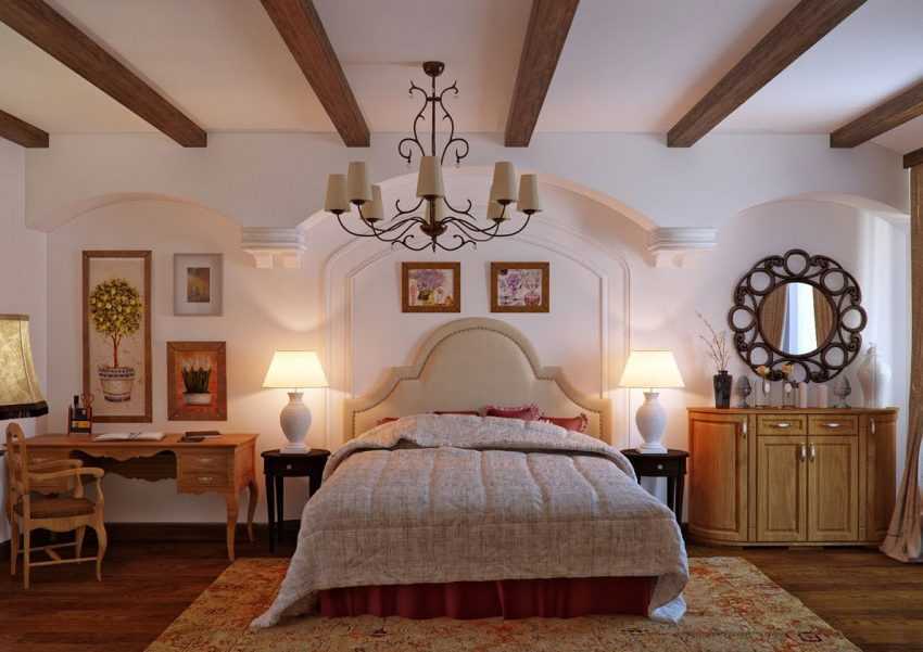 Рекомендуется выбирать контрастные варианты, привлекающие к себе внимание. В условиях просторной спальной комнаты можно использовать роскошные фальш-балки
