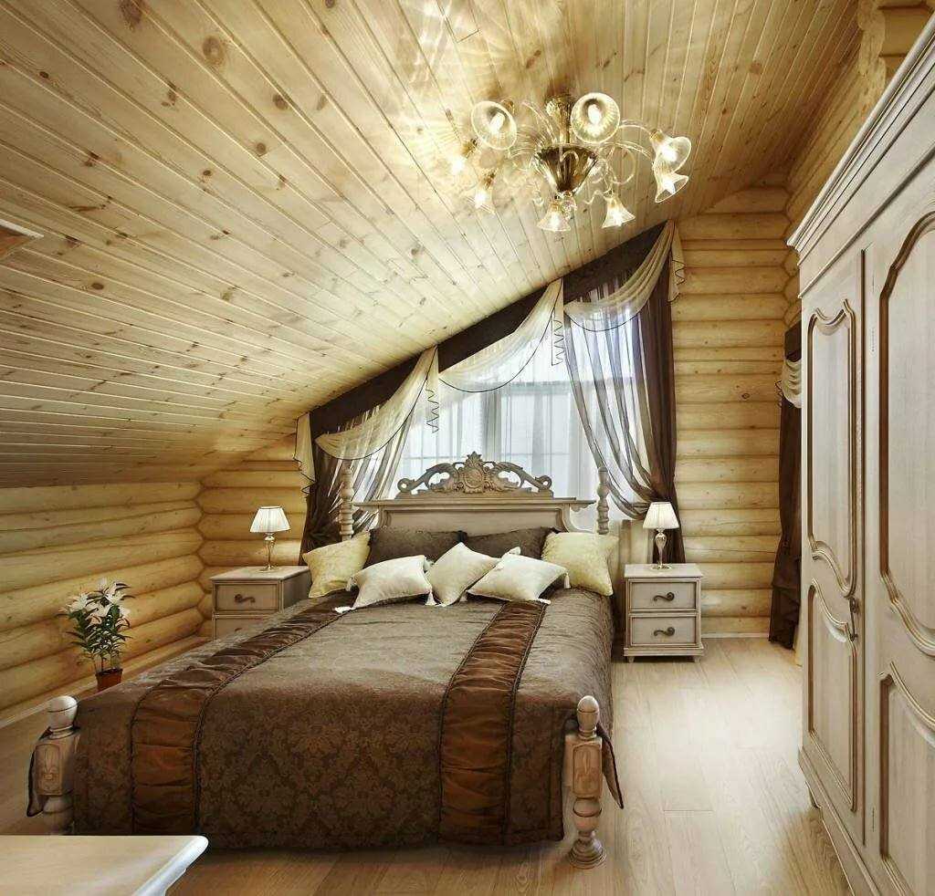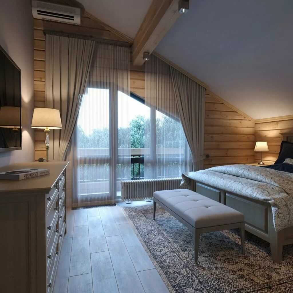 Чуть проще дело обстоит в жилищах из оцилиндрованного бруса. Для таких спальных комнат можно не докупать стеновые отделочные материалы, так как сам по себе брус выглядит очень эффектно и уютно.