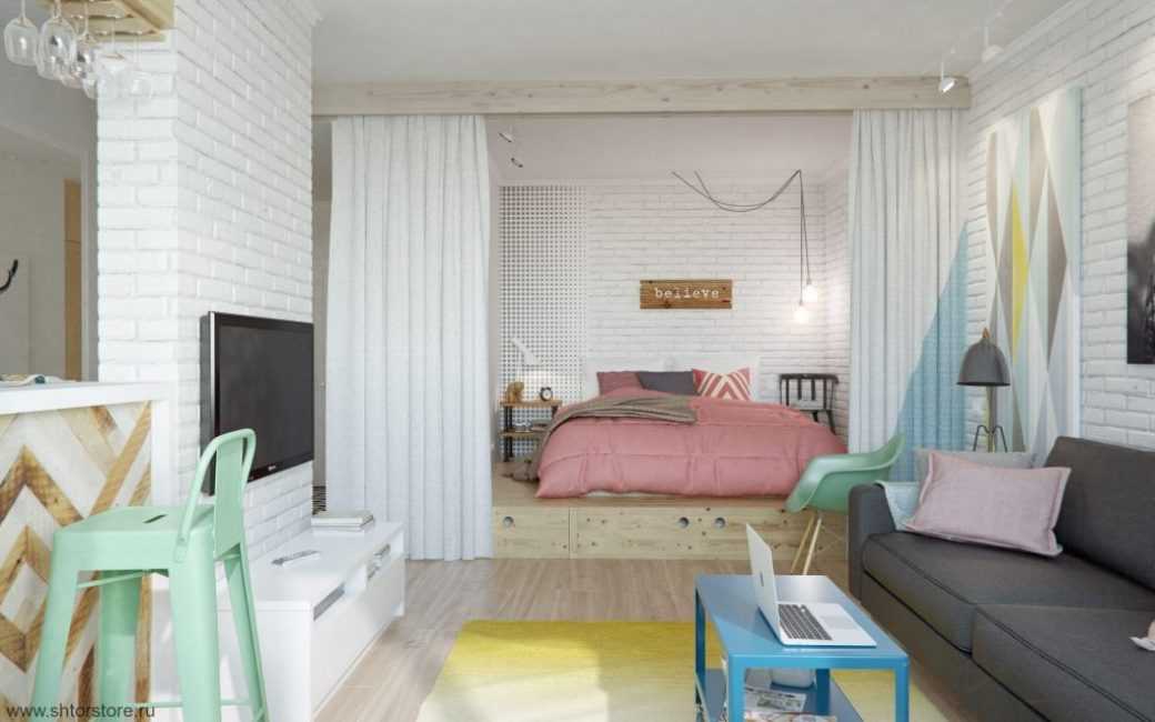 Благодаря такому зонированию можно рационально задействовать каждый сантиметр площади, а в однокомнатной квартире позволяет улучшить условия проживания.
