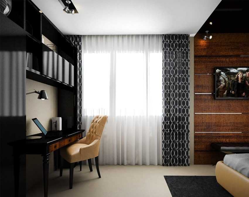 Решив обустроить спальню-кабинет на ограниченном пространстве, постарайтесь разбить площадь на зоны так, чтобы рабочий уголок оказался у окна. Кроме того, что в дневное время этот обеспечит достаточное количество света для работы, так еще и кровать останется за спиной, и не будет навевать ненужные мысли.