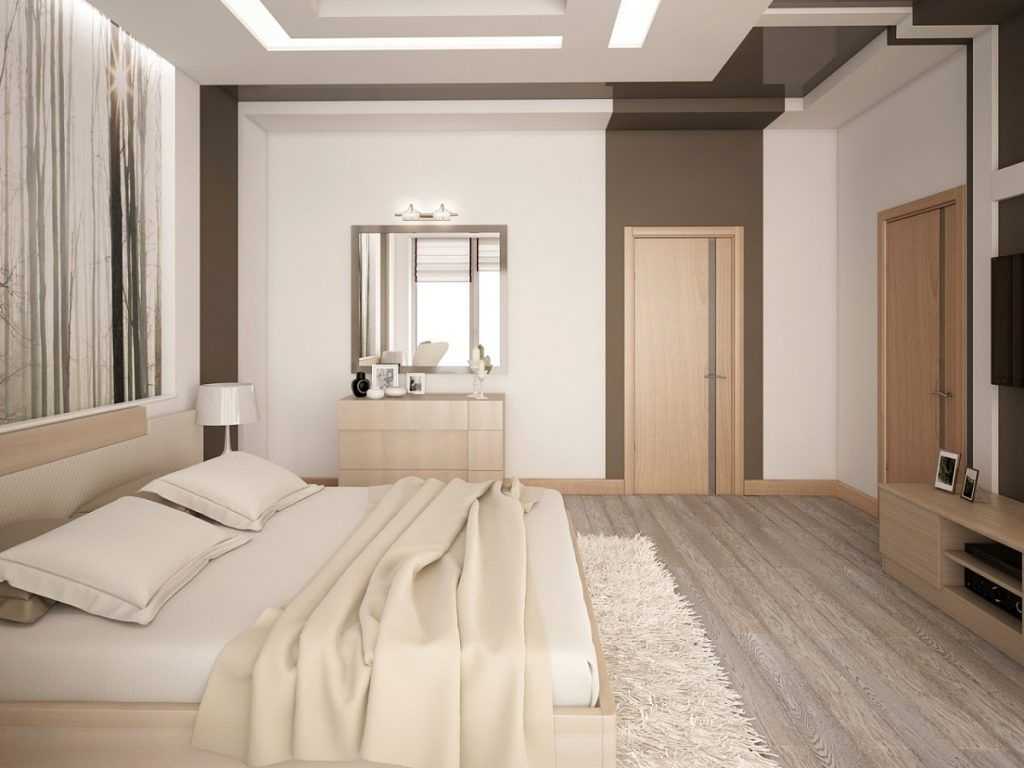 Обязательно наличие кровати, стула или пуфа, туалетного столика и шкафа. Если площадь помещения позволяет, то лучше добавить уголок для досуга, где ставят стеллаж с книгами, миниатюрный журнальный столик и кресло или кушетку. Под телевизор выделяют отдельную тумбу или нишу. Как вариант его можно повесить на стену напротив кровати.