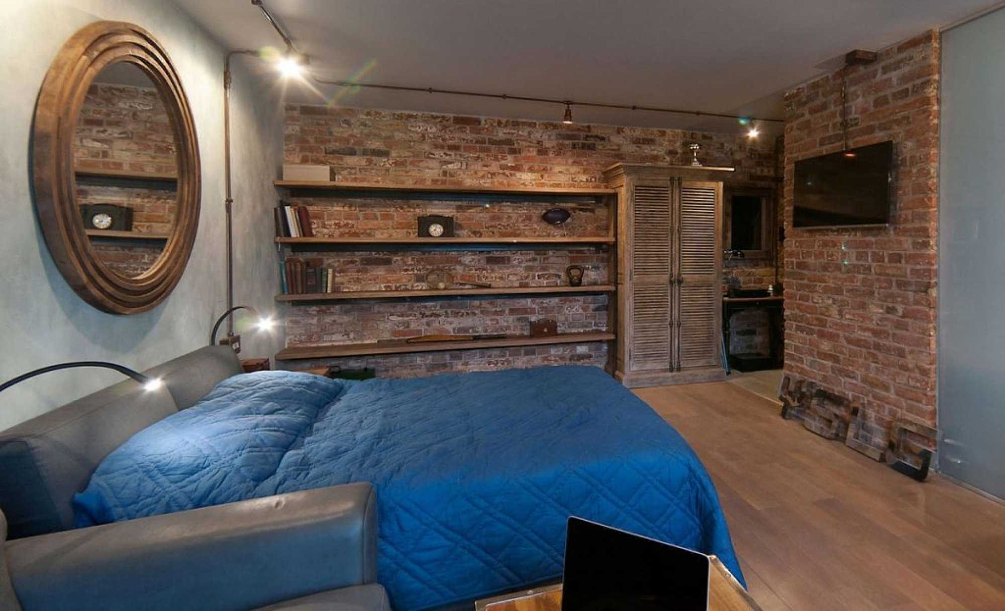 - использование фактурной кирпичной кладки и грубого древесного массива в оформлении стен;