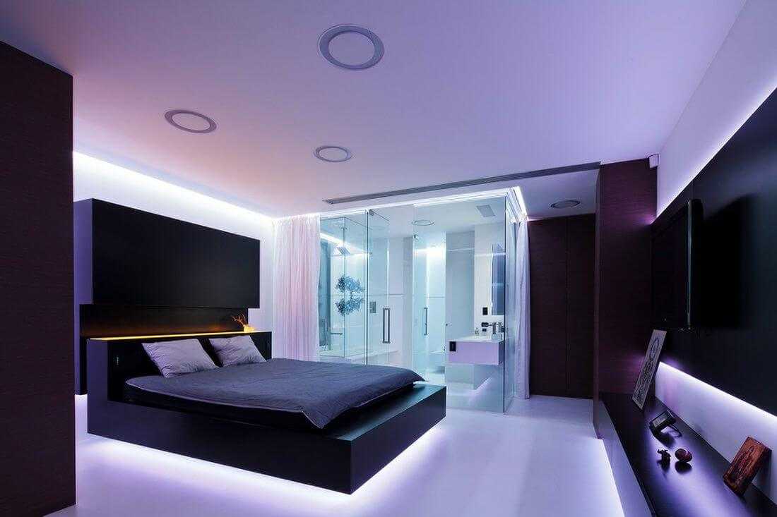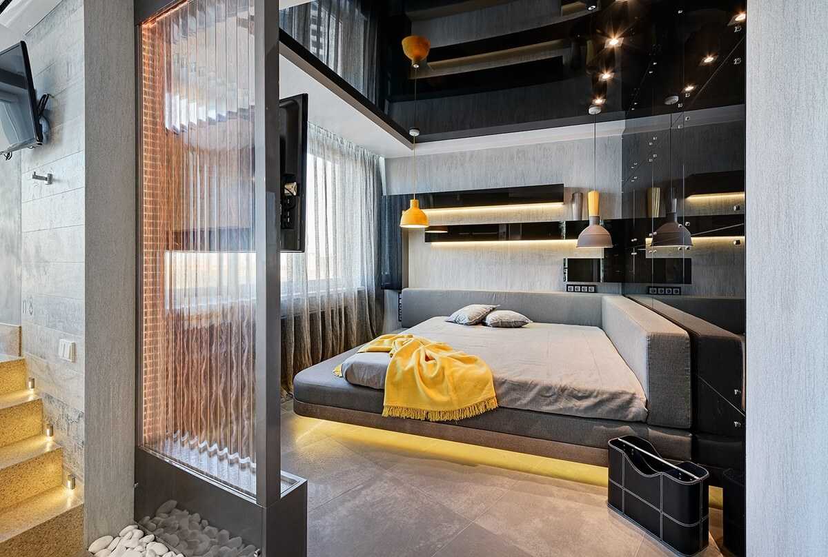 Отделка стен, однако, может быть и более затейливой. Металлизированные обои с геометрическим узором, стеклопанели со строгим декором, винил с фактурой «под кожу», большие зеркала – все это можно интегрировать в хай-тек, если речь идет о стенах спальни.