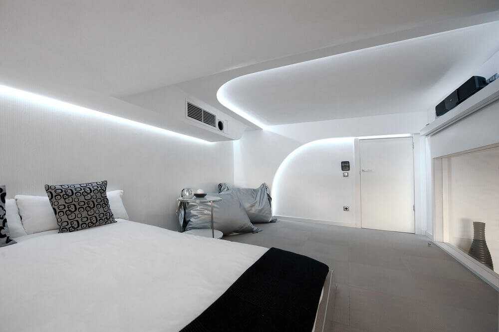 Кстати, несмотря на то, что фавориты стиля – краски прохладные, индифферентные, потолок допускается сделать более теплого, бежевого или песочного цвета. Это «согреет» спальню, окутает её уютной поволокой.