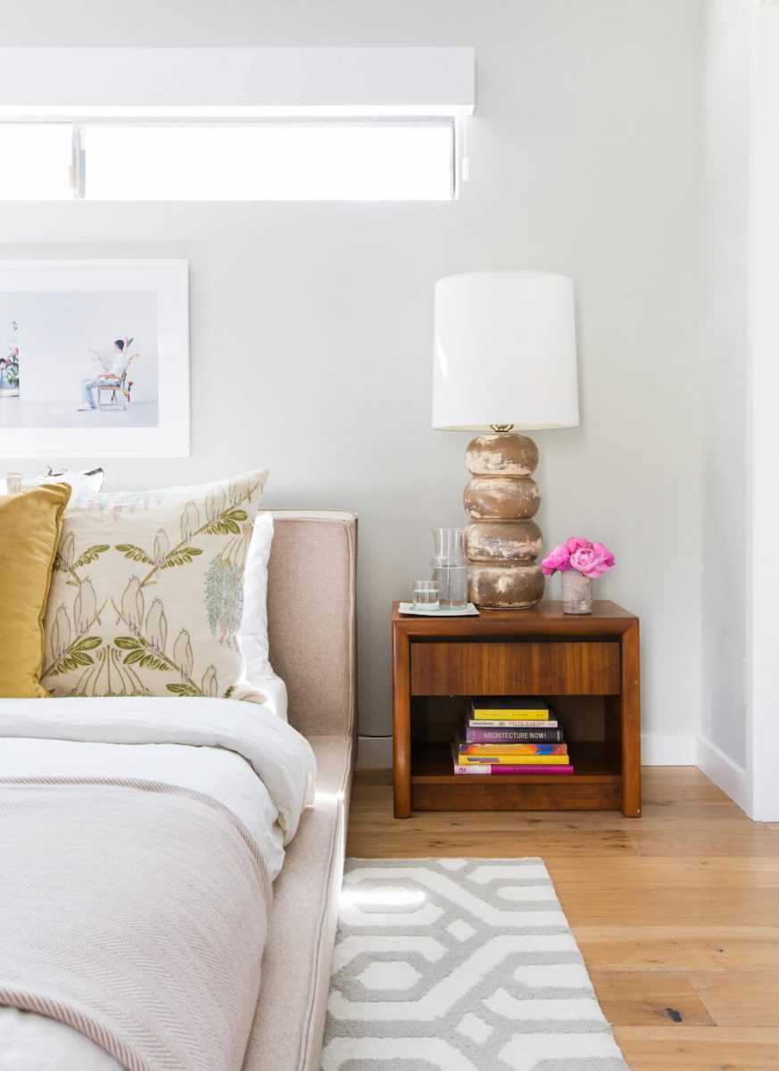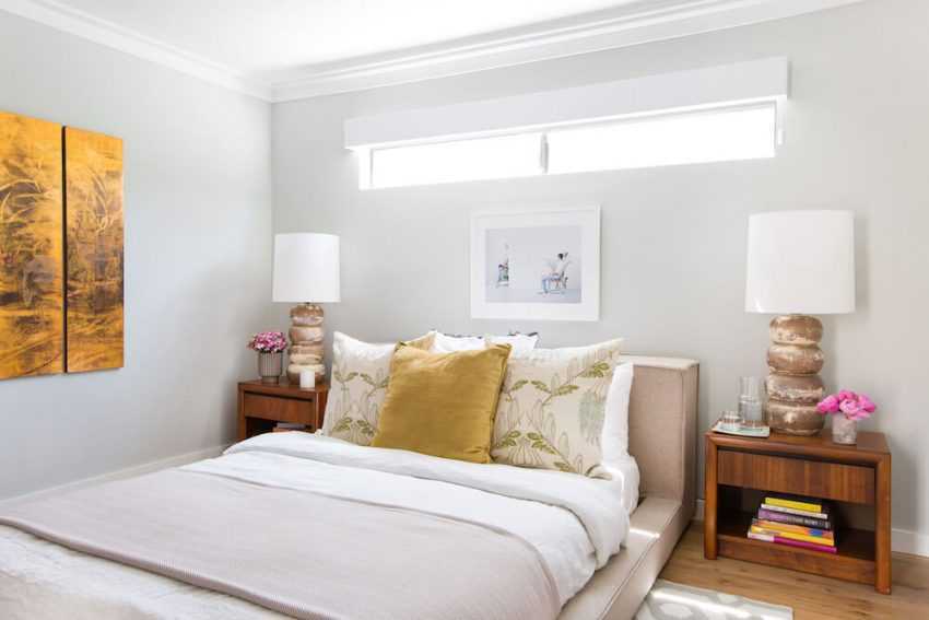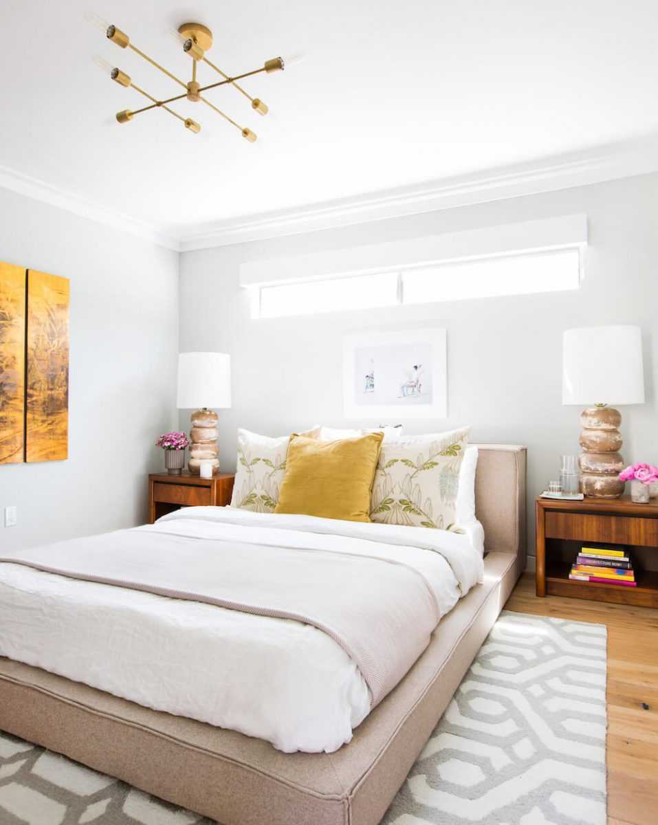Небольшие тумбочки в прикроватной зоне позволяют разместить на них необходимые мелочи и настольные лампы