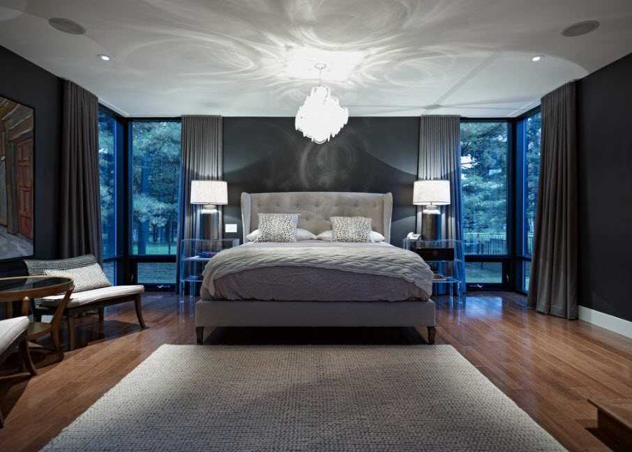 Особое внимание нужно уделить стенам, для оформления которых используют деревянные панели, декоративную штукатурку или обои. Стоит отметить, что для отделки спальни нужно выбирать исключительно высококачественные и дорогие материалы, способные служить долгие годы