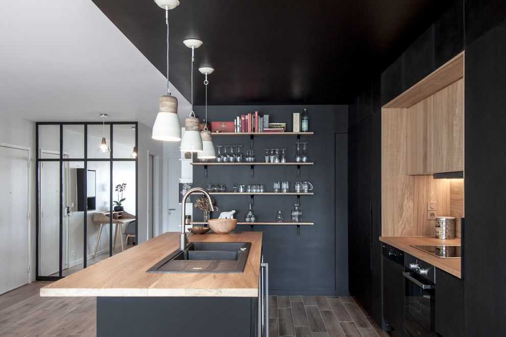 Кухня, продолжая тему гостиной, выполнена в черных тонах. Мрачный цвет разбавлен светлыми оттенками: белая столешница у окна, крупная напольная плитка и мозаичное покрытие стен цвета беж. Сквозь окно попадает достаточное количество света, придавая мягкость черным тонам интерьера. Однородная структура поверхности мебели сочетается с пузырчатой фактурой отдельных вставок. Такую же тему поддерживает двухцветный вытяжной шкаф.