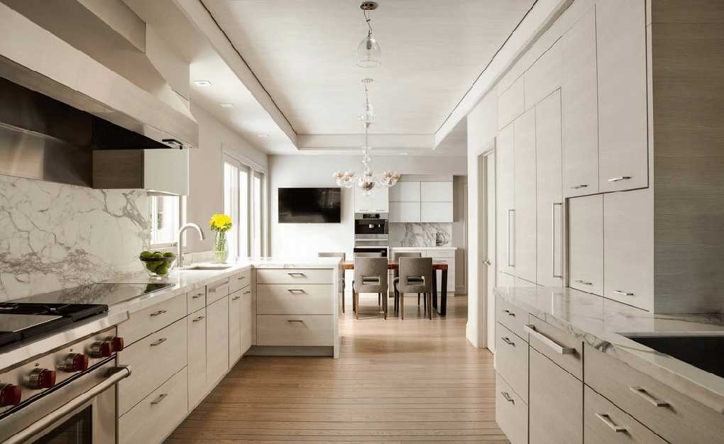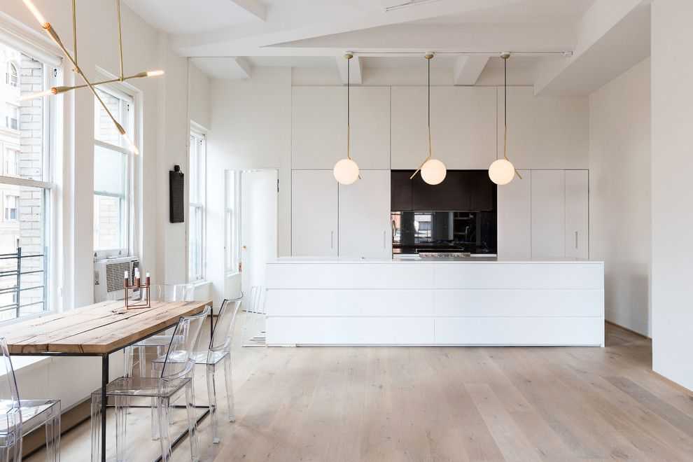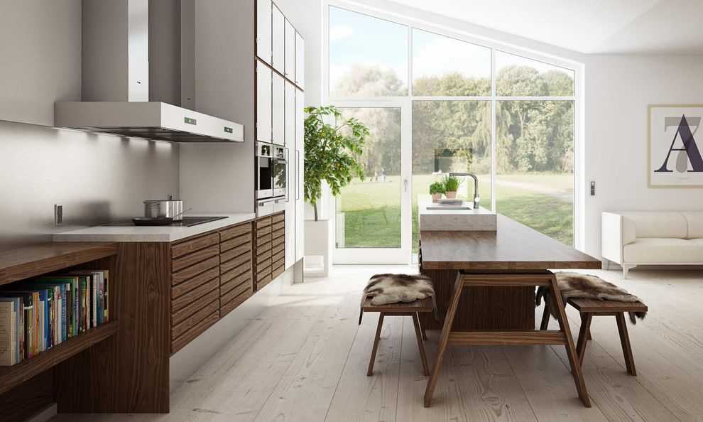 Несмотря на небольшие размеры помещения и кажущуюся простоту интерьера, все конструкции практичны, имеется вместительная система хранения. Рабочая зона вынесена в сторону окна. Квадратная мойка оснащена двумя смесителями: для мытья посуды и для подачи питьевой воды. В шкафах нижнего уровня расположено большое количество ящиков и духовой шкаф. На противоположной стене выстроена вместительная конструкция с полным отсутствием ручек. Скрытая система «push-tu-open» позволяет открывать дверцы легким нажатием руки. У стены, прилегающей к окну, расположен холодильник, встроенный в шкаф. Эта же конструкция содержит витрину и дополнительные ящики.