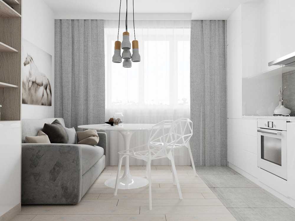 На фото дизайн квартиры 35 квадратов с окном, оформленным гардинами и портьерами в светлых тонах.