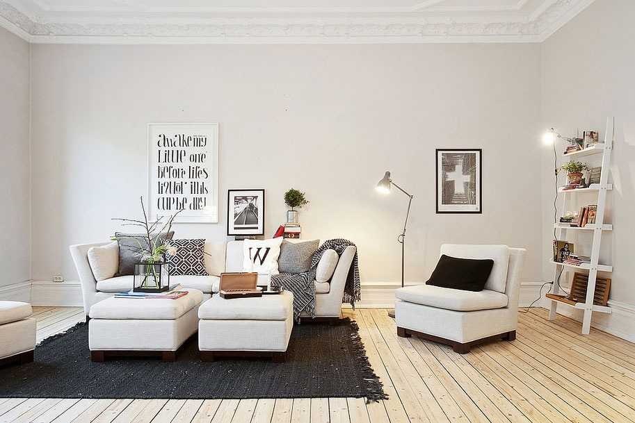 Аскетичный скандинавский стиль допускает применение декора нежно-белого цвета. Такой вариант актуален, если в квартире маленькие окна.